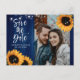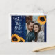 Fotovykort för anpassningsbar, rustik marin blått och solros bröllop spara datum, med lavingbakgrund med ljus och solblommor. Utformning av ett kort för perfekt för en marin blå rustik land eller ladugård som inspirerats av solblommor.