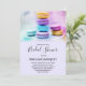 Inbjudningskort för möhippan med ett utsökt foto med en stapel av färgstarka makaroner.
