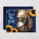 Fotokort från Rustic navy blue och sunsun bröllop spara datum med solblommor på en lada-träbakgrund, försedd med sträng ljus. Perfekt kortdesign för en marin blå rustik land, trädgård, trädgård eller ladugård bröllopsfest som inspirerats av solrosblommor.