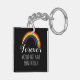 Personligen av nyckelkedjan för husfoto med dina älskade sällskapsdjur namn och data på ena sidan och den andra är en bild av en regnbåge med det söta ordspråket "Forever skulle inte ha varit tillräckligt långt".