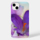Ett telefonfodral med ett underbart foto av en mörk lila-krokset inuti ett glas burk. Det finns en lätt blommar för lila i bakgrunden.