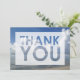 Denna djärva, mångsidiga design har en fotobakgrund som du kan ändra till din egen bild om du vill. Bilden jag använde är av stranden med stilla vågor under en blå himmel fylld med feta vita ludna moln. Ovanpå fotografiet har jag placerat en genomskinlig rektangel som har "TACK" utskuret med en djärv sans-serif-teckensnitt. Baksidan lämnades tom för ditt personliga meddelande.