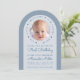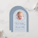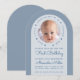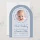 En modern inbjudan till ettårsfirande för en pojke. Mot en dammig blå bakgrund finns en vit valvbåge med ett runt utrymme för foto och klassisk blå text inuti. Runt fotot finns den välvda texten "Vår lilla älskling blir ett år" med små röda hjärtan mellan orden. Tillfället Ettårsdag och namnet är skrivna med en handskriven stil.