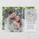 En bröllopsinbjudan med ett foto som sträcker sig över hela sidan, ett typografiskt överlägg som inkluderar dina initialer i ett monogram. Och den innehåller en vacker grön bladbakgrundsdesign.