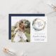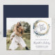 Det här boho-sparat datum-kortet har en boho- akvarellkrans av vita blommor, torkad lövverk och en blå måne på en guld cirkulär ram. Byt enkelt ut exempelbilden mot ett foto av de två. Anpassa den eleganta mörkblå handskrivna stilen med namnen på bruden och brudgummen, och den sans serif-texten med datum och plats. Baksidan är en matchande nyans av enfärgat mörkblått.