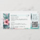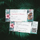 Ett trendig som är utformat för en inbjudan till ett biljett-bröllop med ett tropiskt måltema (Hawaii osv.) med en vattenfärgad illustration av en tropisk strand och hibiscus blommor kommer att glädja par och gäster, tittar fram till den stora dagen. Mall för ett bild av lycklig-paret. Allt i en bröllopsinbjudan som innehåller detaljer på baksidan och OSA kort med en QR-kod.