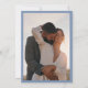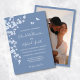 Denna dammtorbla blommiga bröllopsinbjudan har körsbärsblomgrupper på en dammtorbla bakgrund. Med brud och brudgum namn i en elegant handskriven stil. Ert foto på baksidan.
