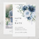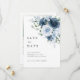 En modern och elegant dammig blå och marinblommig "Save the Date" med en mjuk akvarellbukett på framsidan och en fullständig fotobakgrund för ert favoritbröllopsfoto.