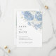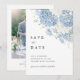 En tidlös dammig blå och vit blomsterfoto "save the date" med mjuk akvarellhydrangeakonst på framsidan och en layout för full foto på baksidan för din förlovning eller parets foto.