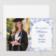 En elegant design för examensfirande med en delikat blå toile-blommig ram inspirerad av klassiskt europeiskt porslin och vintage botaniska tryck. De intrikata blommorna ramar in en ren välvd mittpanel och skapar en förfinad och tidlös komposition som framhäver examenens namn och evenemangsinformation på ett vackert sätt. Mjuka blå nyanser mot en skarp elfenbensvit bakgrund ger designen en sofistikerad men firande känsla. Perfekt för en stilfull examensfest med en klassisk, romantisk estetik.