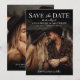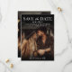 Mörkt och elegant bröllod "Save the Date"-kort. Denna design fångar en förfinad, stämningsfull estetik med helsidesfoton både på framsidan och baksidan. En svart gradient överlagras på toppen och botten av framsidans bild och framhäver vit text i en vacker blandning av elegant skrivstil och klassiska serif-typsnitt för en djärv men sofistikerad effekt. "Save the Date" är framträdande placerat högst upp, följt av parets namn, bröllopsdatum, stad och stat, med "Formell inbjudan följer" subtilt placerat längst ned.