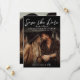 Enkel mörk bröllopsinbjudan för Save the Date-kort. Denna design har en sofistikerad och stämningsfull känsla med helsidesfoton både på framsidan och baksidan. En svart gradient överlagras på toppen och botten av framsidans foto, med vit text i en blandning av elegant skrivstil och klassiska serif-teckensnitt för en slående men ändå förfinad look. "Save the Date" visas högst upp, följt av parets namn, bröllopsdatum, stad och stat. "Formell inbjudan följer" visas subtilt längst ner.