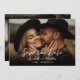 Enkel minimalistisk boho chic bröllops korthälsning. Denna mörka, rustikt inspirerade design har horisontella helsidesbilder på framsidan och baksidan, perfekt för par som söker en avslappnad elegant eller lantlig estetik. En svart gradient längst ner på varje sida tonar ut i bilden och skapar en stilfull kontrast för text i vit handskriven kalligrafi. Framsidan innehåller "Spara datumet", tillsammans med parets namn, bröllopsdatum och plats. Gradienteffekten kan tas bort för en renare, mer naturlig bildlook.