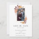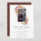Meddela bröllop i stil med den här Blommigten för höst i Elegant Spara datumkortet. Med mjuka vattenfärger i varma falltoner, parade med ett modernt skript och ditt favoritfoto, anger den här designen perfekt tonen för det kommande firande. Det här anpassadet är perfekt för fallbröllop, roliga teman eller botaniska ceremonier.