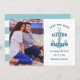Nautiskt "gifter sig" bröllop spara datum-kort har en förlovning foto av paret med ett modernt och enkelt bröllop-monogram av bruden och brudgummen namn som visas över ett båtankare. Anpassa med ditt foto-, namn- och bröllop-datum. Planen för marinblått, vitt och akvblått sommar-färg. En chic mönster i vågrät rand går bakåt på kortet.