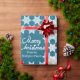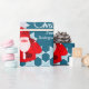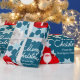 Roliga ljusa julfamiljfoto som slår in gåvan, skyler över brister i blått, röda grå färg och vit med festliga Santa uthärda gåvor. Skräddarsy med ditt egna två speciella familjfoto, efternamn eller meddelande. Läser för närvarande god jul från den Rodríguez familjen. Unikt designat vid Sarah Trett.