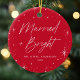 Modern helgdag-prydnadsföremål med "Gift och ljus" som visas i ett handskript som omges av en gräns av vita stjärnor mot en röd bakgrund. Anpassa utsmyckningens framsida genom att lägga till ditt namn och året. Baksidan av prydnadsfunktionerna i ditt foto från bröllop skapar det perfekten för din första jul som gift par.