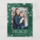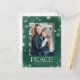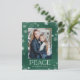 Impress alla på din julkortslista med ett helgdag-vykort för elegant. Den unika julvykortsbilden visningar ditt favoritfamiljefoto på framsidan med ett gräns-vitt snöflingor mot en grönt vattenfärgsbakgrund. "Fred" visas i ett modernt serif-teckensnitt i trendiget med namnet eller anpassningsbarna som visas nedan. Baksidan av vykortet för helgdag innehåller din returadress, ytterligare ett foto och rymmer ditt anpassningsbar-meddelande. Utformningen koordinerar med vår Frosted Peace-julkortsamling.