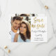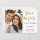 Hand Lettered Faux Gold Foil Script Bröllop spara datum Photo Card.Spara datumfotokortet kan ändras så att det innehåller ditt namn och din bild. Det här fotokortet har en bild på framsidan och baksidan som kan bytas ut.