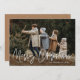 Modern helgdag-fotokort med vågräts foto med "God jul" i ett vitt handskript. Anpassa fotojulkortet med din familj namn och året. Det enda fotokortet återgår till visningen med ett ytterligare foto och en karamellbrun bakgrund med subtila vita helgdag.