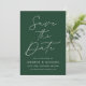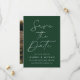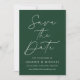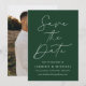 Meddela ditt kommande bröllop i stil med det här trendiget Spara datumkortet med hjälp av Modern Grönt-fotot! Designfunktionerna "Spara datum" som visas i trendigets vita kalligrafi med mörk grönt bakgrund. Anpassa minimalisterna spara datumet med namn, bröllop-datum, plats och bröllop webbplats. Datumet återställs till visning av förlovningen för fullt-utfall i lodrät. Grönten chic sparar det datum då perfekten ska väljas för det moderna bröllop.