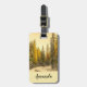 Ett bagagemärke med ett vackert naturfotografi. En isolerad vinter väg med högt snö täckte träd i gräs. Ett gyllene skal skapar en magisk känsla för det här fotot.
