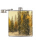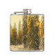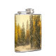 En kolv med ett vackert naturfotografi. En isolerad vinter väg med högt snö täckte träd i gräs. Ett gyllene skal skapar en magisk känsla för det här fotot.