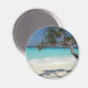 En magnet med ett vackert soligt foto. Turkos tropiska blå havets vatten, med vit sandstrand. Ett solo tropiskt träd är ett fint ställe som kan slappna av och njuta av denna sceniska idylliska plats.