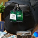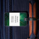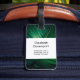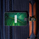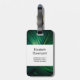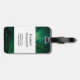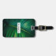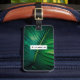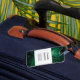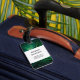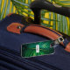 Ett bagagemärke med ett foto av en grönt tropiska löv som visar några vibrerande handflatan fronder. En vit rektangel ram överst med texten inuti.