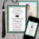 Dela glädjen av en gymnasie- eller högskoleexamen och bjud in familj och vänner att fira med dessa anpassade fotogröna, svarta och vita festliga inbjudningsannonser. (TIP FÖR BILDPLACERING: Ett enkelt sätt att centrera en bild exakt som du vill är att beskära den innan du laddar upp den till Zazzle-webbplatsen.) Denna formella mall innehåller föräldrarna och examenens namn, samt all information du väljer, till exempel festdetaljer, speciella utmärkelser, examina, favoritcitat, examenens nya adress, framtida utbildningsplaner eller jobbtitel. All text är enkel att anpassa. Designen har en modern vit bakgrund, svart studentmössa, elegant kalligrafi, traditionell typografi och ett foto som du väljer, till exempel en seniorbild eller bild från examensceremonin. Dessa examensannonser är ett trendigt och elegant sätt att dela din speciella dagsfirande med familj och vänner. Grattis till examen!