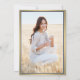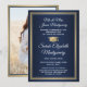 Dela glädjen av en gymnasie- eller högskoleexamen med dessa anpassade foton i marinblå, guld och vita meddelanden. (TIP FÖR BILDPLACERING: Ett enkelt sätt att centrera en bild exakt som du vill är att beskära den innan du laddar upp den till Zazzle-webbplatsen.) Denna formella mall innehåller föräldrarna och examenens namn, samt eventuell text du önskar, såsom detaljer om festinbjudan, särskilda utmärkelser, examensinriktning, favoritcitat, examenens kontaktinformation, framtida utbildningsplaner eller nytt jobb. All text är enkel att anpassa. Designen har en modern blå ombre-bakgrund, falskt guld foliekanter och examensmössa, elegant script- och tryckskrift samt ett foto som du väljer, till exempel en seniorbild eller bild från examensceremonin. Observera att guld är tryckt i färg, inte metallfolie. Dessa examensmeddelandekort är ett trendigt och elegant sätt att dela din speciella dags firande med familj och v