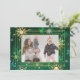 Guldsnöflingor på en vacker julgrön och gul snöflingebakgrund. Säsongsbetonad gratulationskort. Trippel faux guld fin ram. Lägg till dina favoritfamiljefoton för att personliggöra denna skönhet. Så enkelt, men chic.