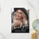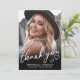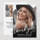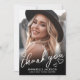 Detta enkla och minimalistiska tackkort för examen har ett helsidesfoto på framsidan med en svart gradient längst ner, överlagt med vit text för en snygg, modern utseende. ”Tack” visas i elegant handskriven stil, omgiven av små hjärtan doodles för en söt, genomtänkt touch.