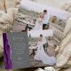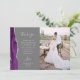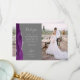 Skicka din familj och vänner ett speciellt tack för bröllopet med dessa anpassade fotokort. Till vänster visas orden "tack" i elegant silvergrå handskriven typsnitts typografi på en medelgrå bakgrund över ett kort, redigerbart tackmeddelande till era bröllopsgäster i koppartryckstil, med era namn nedan. En violett akvarellagategräns, kantad med falskt silverglitter, pryder den vänstra kanten. Baksidan ger utrymme för ett andra, horisontellt foto.