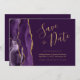 Detta eleganta moderna spara-datum-kort har en lila akvarell-agat-kant med falskt guldglitter. Den anpassningsbara texten kombinerar guldfärgad handskriven stil, kopparstick och kursiv stil på en rik plommonfärgad bakgrund. Byt enkelt ut exempelbilden på baksidan mot ditt eget vertikala foto och lägg till ytterligare information som webbadressen till din bröllopswebbplats.