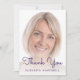 Tack-kort för trendigets moderna födelsedag med ett foto av lodrät anpassningsbar. Ord "Tack" visas i övertäckningen av handskriftsskript i lila, med namn nedan i sans serif-teckensnitt. Ersätt enkelt exempelbilden med ditt favoritfoto. Med en vit övertoning i skärm kan du kontrollera att textpekarna visas. På baksidan finns en silver-droppfaux glitter gräns på lila. Anpassa texten med ditt tack-du-meddelande i silver grått.