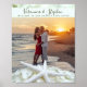 Bröllopsaffisch skylt med fotomall och anpassad text. Vit sjöstjärna och hortensia design på affischpapper i storlek 8x10 tum. Bilden, som innehåller en naturlig sjöstjärna som ligger ovanpå en stor vit hortensia blomma, är längst ner och överlappar fotot. Paret namn står högst upp i elegant skrivstil med en enda rad tryckt text under. Exempel på uttryck är “Välkommen till vår lyckliga framtid”. Det vita strandtemat matchar vår designlinje Seaside Garden.