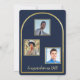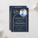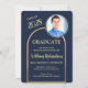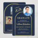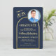 Denna eleganta examensfestinbjudan har en dubbelbåge med förgyllda bokstäver på en marinblå bakgrund och ett fält för ett foto av festens hedersgäst. Baksidan av kortet har plats för ytterligare tre foton. Mycket att anpassa för att passa din hedersgäst. Har du några designfrågor? Skicka då ett meddelande eller ett mejl till charmdesignstudio@rcn.com, så hjälper vi dig gärna. Kontakta oss också om du önskar att bakgrundsfärgen ändras till skolans färg eller en favoritfärg.