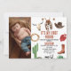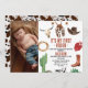 Foto Min första Rodeo Cowboys 1:a födelsedag Inbjudan Söt lilla cowboyinna fick första födelsedag som kan redigeras till kostym i vilken ålder som helst och som innehåller ditt lilla pojkfotografi. Min första inbjudan till rodeo-födelsedag innehåller olika cowboytemplet och lite kakti samt en cowhide eller coprint mönster på baksidan.
