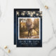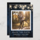 När du har en bröllop som inspirerats av gelikar och vill ha marin, så är det bröllop som åstadkommer båda saker. Den här inbjudan innehåller en marin bakgrund för rustiskt trä, sträng ljus och ett foto.