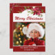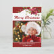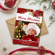 Det här vackra julfotokortet har rik med röda vattenfärgspartier och "God jul" i moderna typografiskript. Anpassa med ditt favoritfoto och hälsning. Kortets baksida matchar den röda bakgrunden med blommigtens accenter. Byt ut exempelfotot mot ditt eget. Design ©Rosalind Moore, Cherry Lane Dedesign