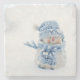 En sten underlägg med ett sött foto av lite snögubbe. Stå utanför vintern med snö som ramlar runt. Den här söta lilla killen är klädd i blå stickad hatt och scarf.