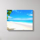 Kanvastryck med ett vackert foto. En vit sandstrand med azurblått vatten. Lättare bild med en solig himlar och mjuk skumbildande surfa med söta tropiska löv som ramar in bilden.