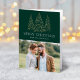 Modern helgdag- och elegant-kort som innehåller ditt foto kompletterat med tre snöfaux-folie från guld gräs träd med grönt (eller färg efter eget val). "God jul" visas i ett vitt, modernt serif-teckensnitt med namnet eller anpassningsbarna nedan. Insidan av det vikt-helgdag innehåller ditt anpassningsbar-meddelande. Kortets baksida innehåller ytterligare ett foto.