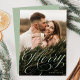 Kort för helgdag av elegant med lodräts foto med "Merry" som visas i ett calligraphy-skript för grönt. Anpassa framsidan av calligraphy-skriptkortet genom att lägga till helgdag nedan. Helgdag återgår till ett subtilt vitt snö mönster med sidans grönt som bakgrund.