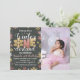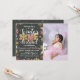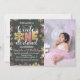 Vinterinbjudan med foto med guld och rosa glitter snöflingor för att fira din lilla prinsessa första födelsedag. Bakgrund i kalktavla.
