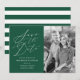 Eleganten sparar datumkorten "Spara datum" som visas i ett vitt kalligrafiskt skript med gröntens bakgrund. Anpassa grönten med förlovningen lodrät, namn, datum och plats för bröllop. Baksidan av det moderna arkivet innehåller datumkortet grönt och vitt rand.