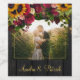 Modern brid- och groomfoto-personlig-vin-etikett med gult guld solblommor och ro bouquet med grönt löv och löv över en bröllop brun lada-trä med strängträ mörk. ++++++++++ Enkel att anpassa med namnen! +++++++++ Det kan vara en söt gåva till nyfödda eller ett bröllop-tack som du vill ha.