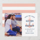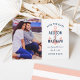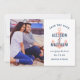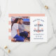 Nautiskt "gifter sig" bröllop spara datum-kort har en förlovning foto av paret med ett modernt och enkelt bröllop-monogram av bruden och brudgummen namn som visas över ett båtankare. Anpassa med ditt foto-, namn- och bröllop-datum. Sommarordningen för marinblått, vitt och rosa (peachy rosa) i färg. En chic mönster i vågrät rand går bakåt på kortet.