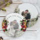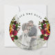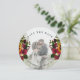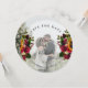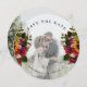 Rustic land, traditionellt rundkort för bröllop spara datum med vackra solblommor och röda burgundybuketter i ro på en genomskinlig övertäckt fotobakgrund. +++++++ Idealisk för sommar- eller höstfallande elegant utomhus, gårdslast eller bakgård bröllop. Anpassa den med brudgummens och brudgummens foto, namn, bröllop-datum och ställe!